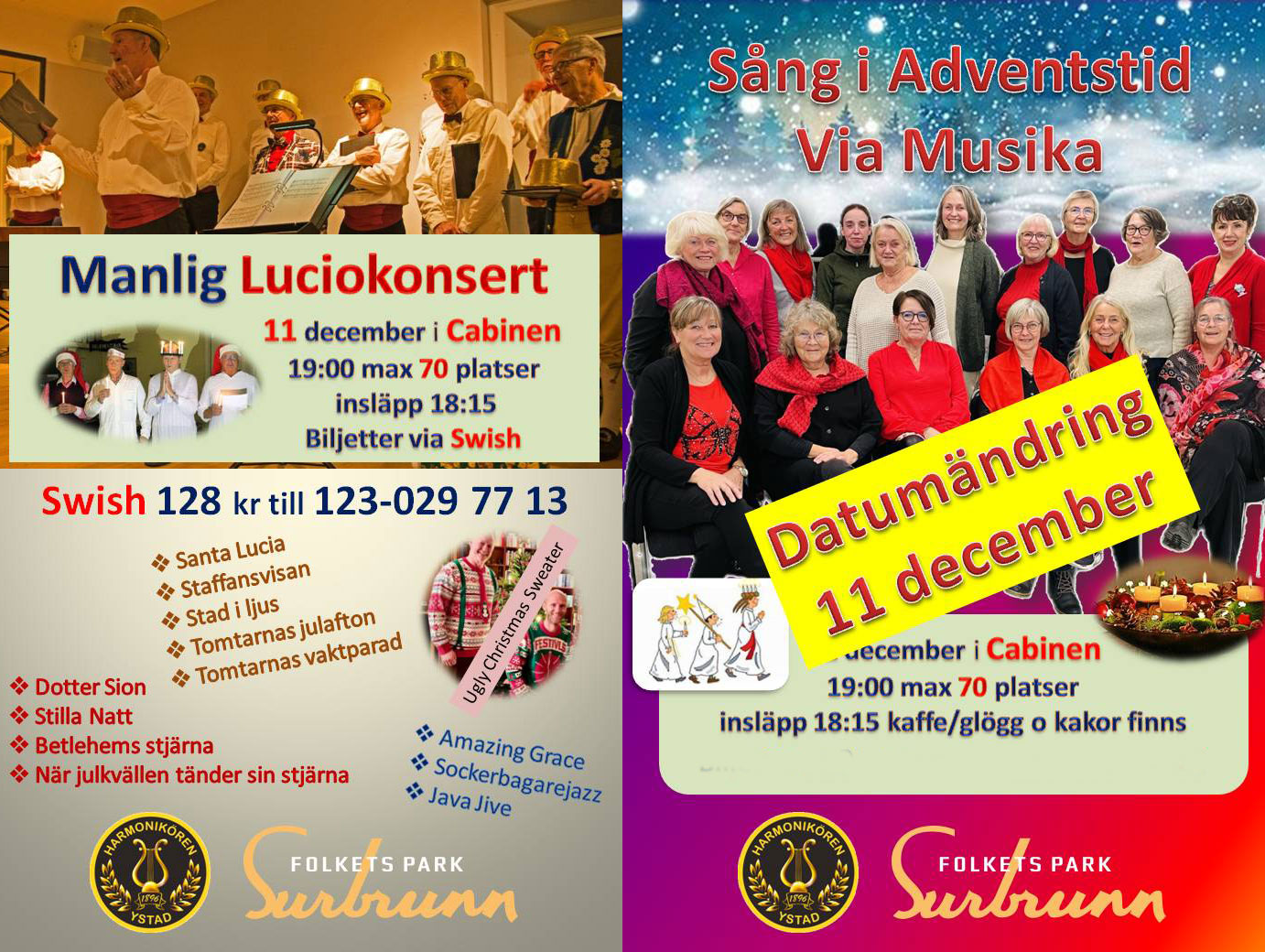 Först inleder manskören Harmoni med ett urval av jullåtar och därefter avslutar damkören Via Musika med sånger i adventstid.